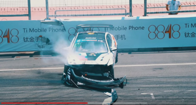 姚元浩參加超跑錦標賽 打滑撞牆車頭全毀