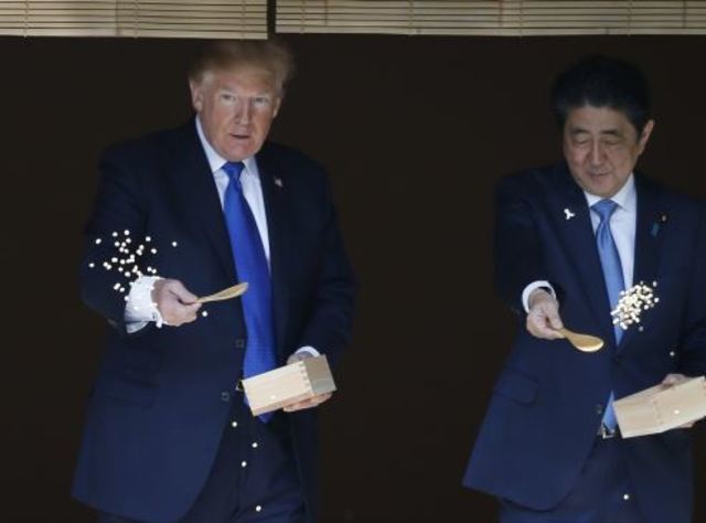 根據《美聯社》報導,川普訪日的第二天,中午與安倍一同用完餐,下午預計要前往迎賓館進行首腦會談。而會談前,安倍邀請川普餵錦鯉,原本川普學習安倍的動作,一匙一匙慢慢餵,