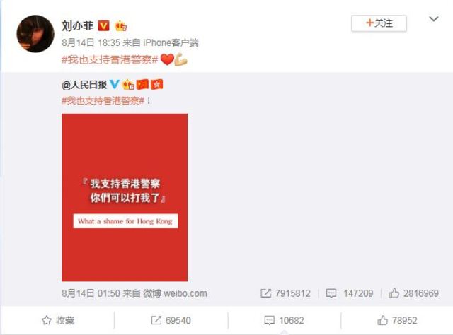 香港反送中事件持續延燒,近日中國許多明星都在微博表示:「我支持香港警察,你們可以打我了」。而演出迪士尼系列電影《花木蘭》的影星劉亦菲也在微博上轉發了這則貼文,讓許多外國粉絲心碎,紛紛表示要抵制由劉亦菲主演的《花木蘭》。