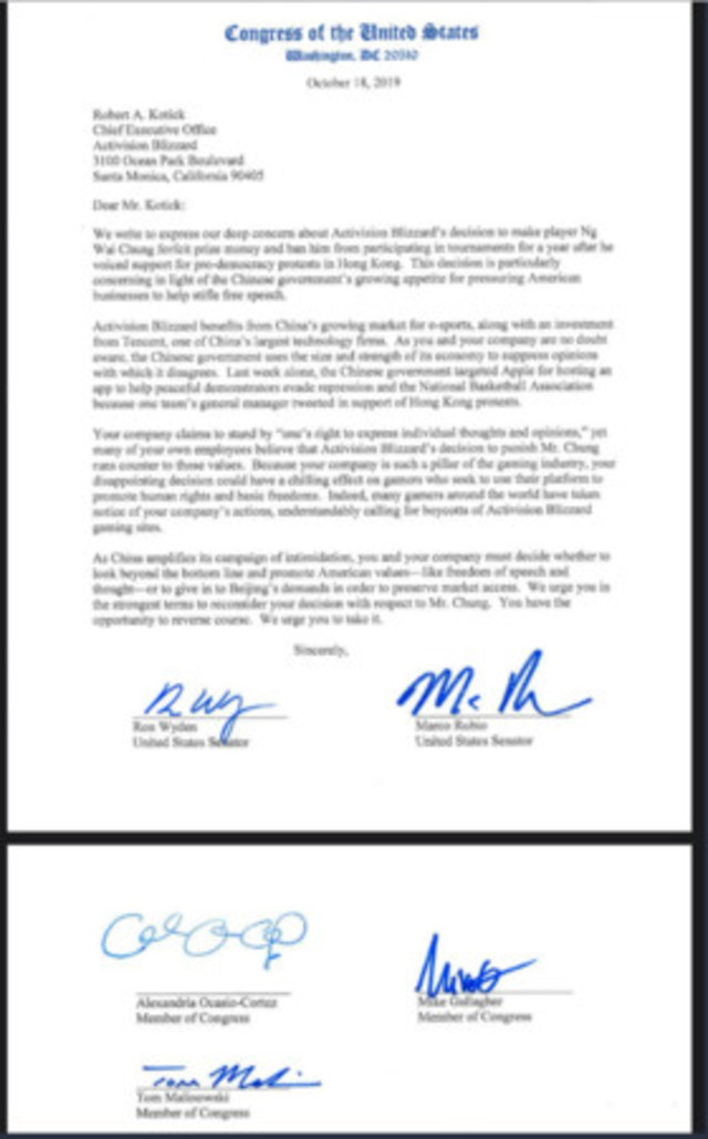 美國共和黨參議員盧比歐(Marco Rubio)、民主黨參議員魏登(Ron Wyden),以及民主黨眾議員歐加修—寇蒂茲(Alexandria Ocasio-Cortez)與馬里諾夫斯基(Tom Malinowski),與共和黨眾議員蓋勒格(Mike Gallagher)等五人,在這封信函上共同簽署聯名。該封信寫給「動視暴雪」的CEO考提克(Bobby Kotick),內容指出,「你們的公司聲稱堅持個人表達思想與觀點的權利,但是你們公司也有許多員工認為動視暴雪懲罰吳先生的決定與這些價值被背道而馳」,同時信中也提到,「由於你們的公司是遊戲業的支柱,你們作出這令人失望的決定,會在那些想要透過這個平台促進人權與基本自由的玩家中產生寒蟬效應」。該封信中也特別指出,「隨著中國影響力的擴大,你(考提克)和你的公司必須思考如何在堅持美國價值觀(如言論自由與思想自由)與廣大市場之間的底線」。