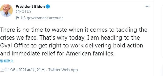 就在發表演說後,拜登隨即以美國總統的身分發布推文,「President Biden」發布貼文,表示「已經沒有時間浪費,我們正面臨危決危機的時刻」,他強調,他已經進入橢圓辦公室,行使總統職權、以大膽的行動,希望要來解脫美國的許多家庭。該則貼文已被美國官方標記為「US government account」。