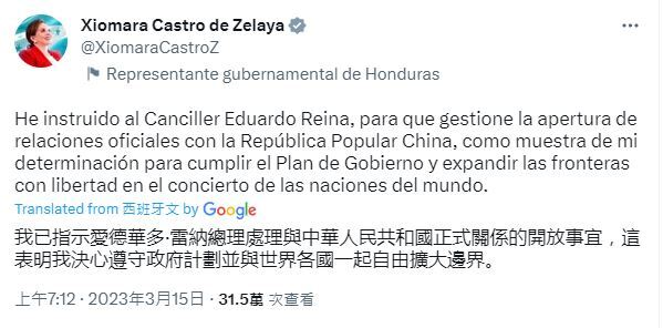 - 又少1友邦? 宏都拉斯總統:與中方處理建交事宜2023/03/15