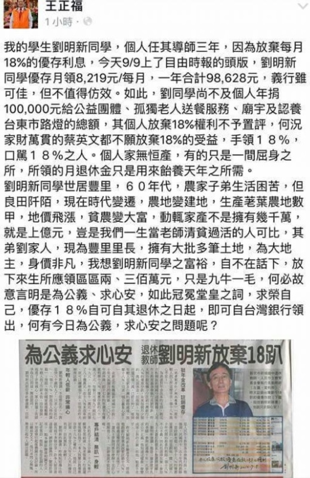 王正福在臉書諷刺「我想劉明新同學之富裕,自不在話下,放下來生所應領區區兩、三佰萬元,只是九牛一毛,何必故意言明是為公義、求心安,如此冠冕堂皇之詞,求榮自己」。對此,劉明新解釋,我的台東老家有父親留下的兩甲「農地」,並不是有心人士未經求證所說的「建地」,現由我二弟耕作,我已向他言明,幾年後我決定要把我分得的五分地「種樹救地球」,不做它用了,哪來有心人士所說的「農地變建地…地價飛漲,貧農變大富,動輒家產不是擁有幾千萬,就是上億元」?可悲的是,惡意做此攻擊的始作俑者,竟是我國中三年的導師!(圖片來源/劉明新.王正福臉書)