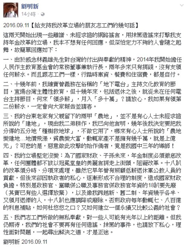 這兩天開始出現一些離譜、未經求證的網路謠言,用抹黑造謠來打擊我支持年金改革的立場,我本不想有任何回應,但深怕定力不夠的人會隨之起舞,故簡單回應如下: