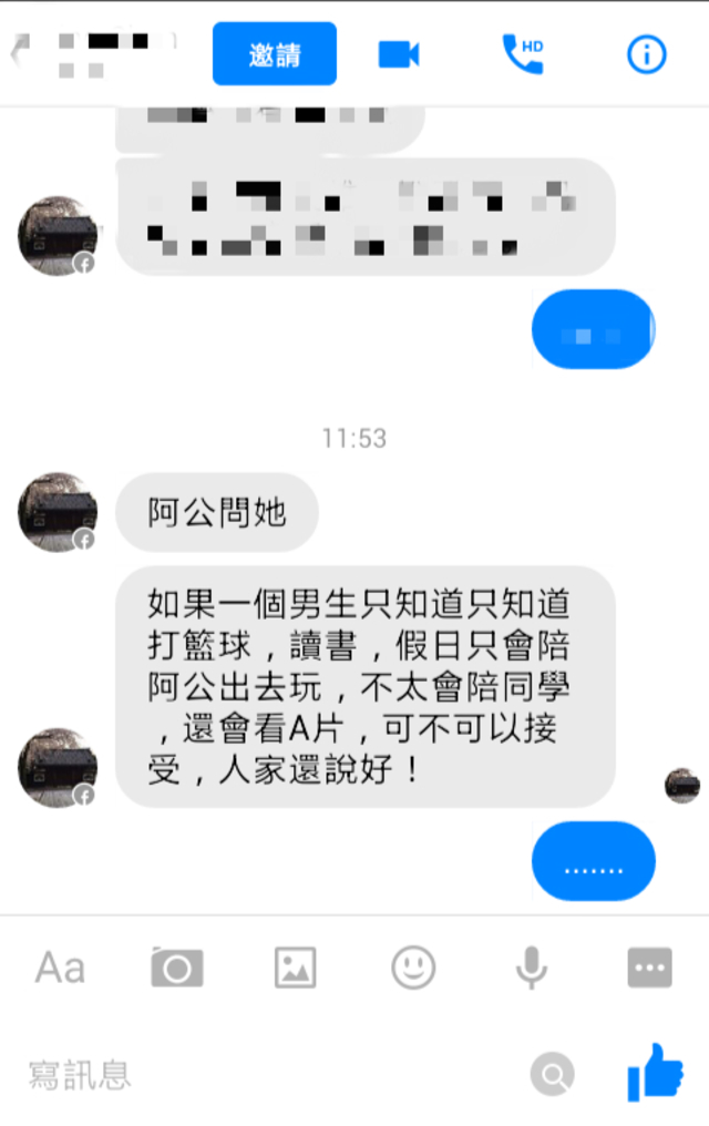 阿公擔心原PO國高中都讀男校,交不到女友,他會無法抱曾孫。因此慫恿原PO去補習班,因為「可以認識女生」。某天原PO發現阿公都偷用他的臉書帳號,抱持著「擔心長孫魯一輩子的心態」跟女生聊天,還向對方坦承是原PO的阿公。沒想到竟然真的順利要到女生的Line帳號,甚至最後變成原PO女朋友。讓原PO相當感謝直呼「只能說阿公有夠專業,我決定認真賺錢存錢帶您去巴西玩!!!」。