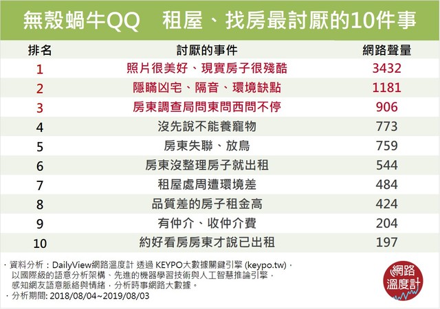 然而無殼蝸牛都有一段必經之路,也就是不斷尋求短暫殼居的「找房之旅」,相信有經驗的人總歸一句話就是「累」,和預期的不同、房東辦事不OK等都讓人很無奈,今天DailyView網路溫度計就透過《KEYPO大數據關鍵引擎》統計房客租屋過程遇到最「啊雜」的無奈10件事!