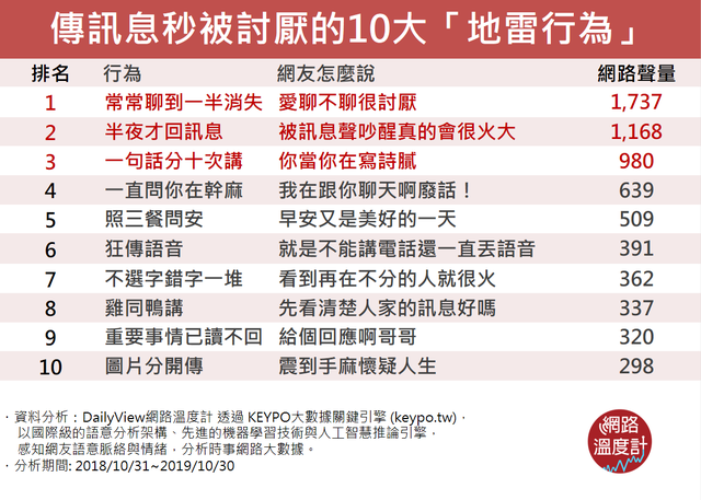 其中,有些習慣則是不少網友討厭,遇到會讓人一秒抓狂的「傳訊息地雷」。今天DailyView網路溫度計》將透過《KEYPO大數據關鍵引擎》,來調查網有最討厭的傳訊息習慣有哪些,看看你曾遇過幾個,或是自己中了幾個!