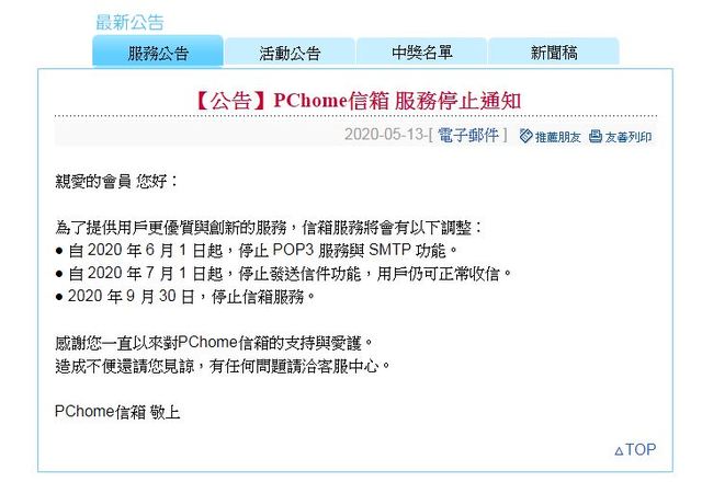台灣電子商務集團PChome網路家庭在台營運超過20年,起初做為入口網站、搜尋引擎,先後還推出電子信箱、網路相簿、新聞台等多樣化的服務,頗受台灣民眾喜愛。 但PChome日前突然發出公告,表示為了提供用戶更優質與創新的服務,信箱服務將在今年9月30日停止服務,在此之前,6月1日起停止停止POP3服務與SMTP功能。自7月1日起,停止發送信件功能,用戶仍可正常收信。