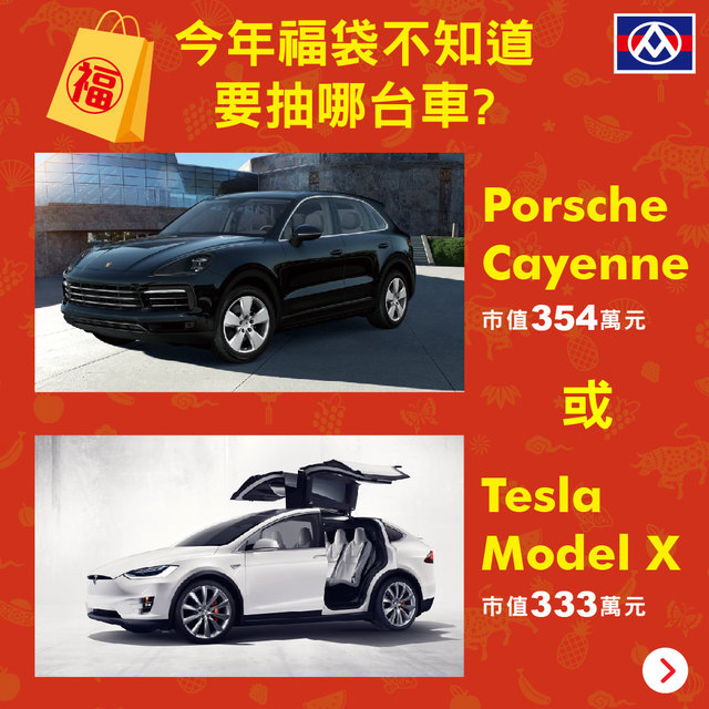 全聯表示,繼去年頭獎祭出市價388萬的「MASERATI」後,今年首次推出福袋頭獎讓消費者投票決定活動,不管是市值354萬元「Porsche保時捷Cayenne」,還是市值333萬元「Tesla特斯拉Model X」,都讓民眾自己決定要抽哪台車,答案將在1月19日對外公布;另外,今年還準備了22名新騎獎「台鈴智慧雙輪eReadyFun」、市值7萬4980元,以及餐券、遊樂園門票、抵用券等豐富獎項,總獎項超過200名,創下新高紀錄。