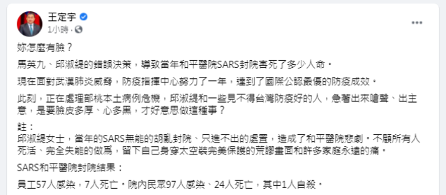 而立委王定宇稍早也在臉書發文,批評邱淑緹和一些見不得台灣防疫好的人,急著出來嗆聲、出主意,「是要臉皮多厚、心多黑,才好意思做這種事?」