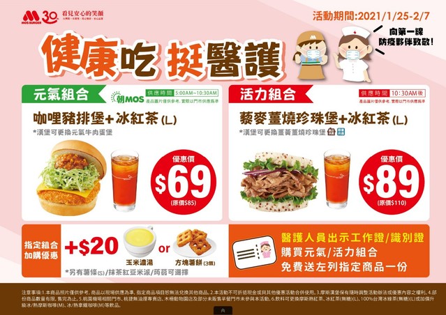 此外,摩斯漢堡表示,凡出示醫護相關證件者,還將免費加贈玉米濃湯乙杯,並可更換為方塊薯餅/抹茶紅豆派/蒟蒻/薯條(S),一般民眾則是點購加20元即可享上述優惠。