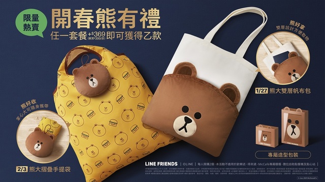 台灣麥當勞與全球知名品牌LINE FRIENDS攜手,將於1月27日起至2月23日止,推出限定「開春熊有禮」限量熊大禮盒,分別為1月27日上午11點首波推出的「熊大雙層帆布包」,以及2月3日上午11點「熊大摺疊手提袋」,兩款全台限量共6萬5千組,民眾只要於麥當勞餐廳內購買任何套餐加價369元,或單買399元即可擁有,限量商品售完為止。