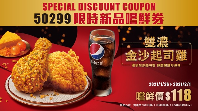 迎接農曆新年,台灣肯德基結合傳統台味,將於1月26日起至3月8日止,推出限定新品「雙濃金沙起司雞」,特別將獨特道地的台式風味金沙起司醬,淋上西式風味的咔啦脆雞,再撒上鹹蛋黃杏仁酥餅碎粒,獨特的香鹹風味,多層次口感熟悉又有新意,是新年不可不嚐的好味道,還可與服務人員玩開運骰盅、比大小,若點數大於服務人員即可獲得原味蛋撻一顆,有吃又有得玩。