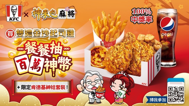 此外,肯德基也與人氣手遊「神來也麻將」再次合作,於1月26日起至3月8日期間,民眾凡購買雙濃金沙起司雞系列套餐、或肯德基多人餐系列,即可獲得限量神來也麻將虛寶刮刮卡一張,最高獎金達100萬神幣,還有肯德基限定神娃等,張張有獎,讓民眾過年與家人、與朋友都能賺飽賺滿。