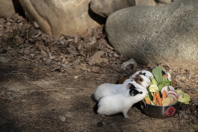今(11)日是農曆除夕,新竹市立動物園、新竹市動物保護及防疫所也備妥動物專屬「年菜」,讓毛孩們春節吃大餐,像是現在最火紅的天竺鼠們就在專屬特製蔬果大盤旁,相聚「圍爐」,可愛萌樣讓大人小孩看了都融化。