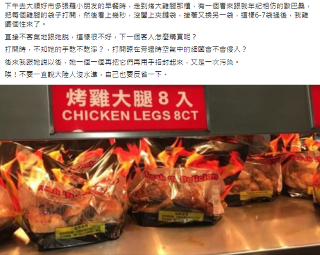 一名網友在臉書社團「Costco好市多 商品經驗老實說」發文表示,他到好市多採買時,走到烤大雞腿櫃前,看到一名婦人把每個雞腿的袋子都打開,看上幾秒、把夾鏈袋闔上,接著再換另一袋,就這樣重複動作6、7袋,撞見這行為的原PO超傻眼,發揮雞婆個性上前阻止。