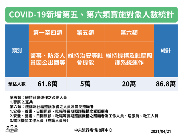 中央流行疫情指揮中心今(21)日指出,考量維持治安等社會機能工作者,與維持長照社福機構與社福照護系統運作之工作者及住民,皆為COVID-19高感染風險或感染後容易產生嚴重併發症之族群,為使上述對象及早獲得免疫保護力,自4月23日起,開放警察、憲兵等維持社會機能運作必要人員及長照社福機構、社福照護系統之人員與受照顧者等接種計畫所列第五及第六類實施對象接種COVID-19疫苗。