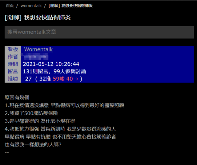 原PO昨(12)日在PTT以「我想要快點得肺炎」為題,並列出4點原因,表示自己這麼想是因為「早點得病,早點有抗體,也不用整天擔心會接觸確診者」。