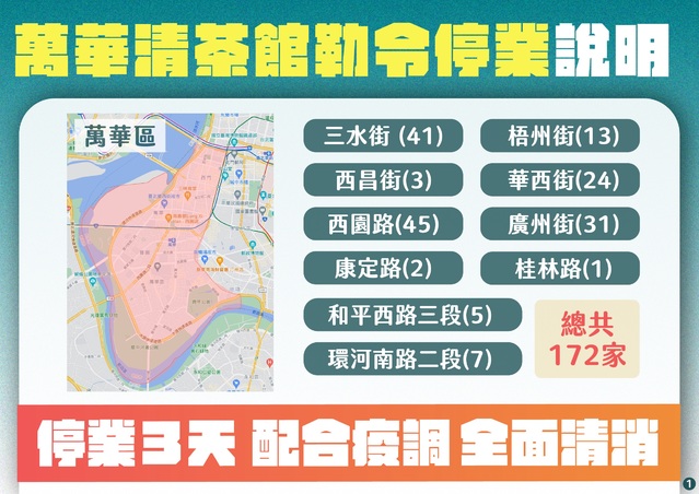 本土染疫風暴持續擴大,台北市政府急追萬華阿公店群聚事件,今(13)日除了宣布172家業者即日起勒令停業3天,配合疫調、全面清消外,也公布高風險傳播匡列範圍,請有COVID-19相關症狀的民眾盡速就醫採檢。同時,北市府也進一步公布最新「暫停開放場域」。