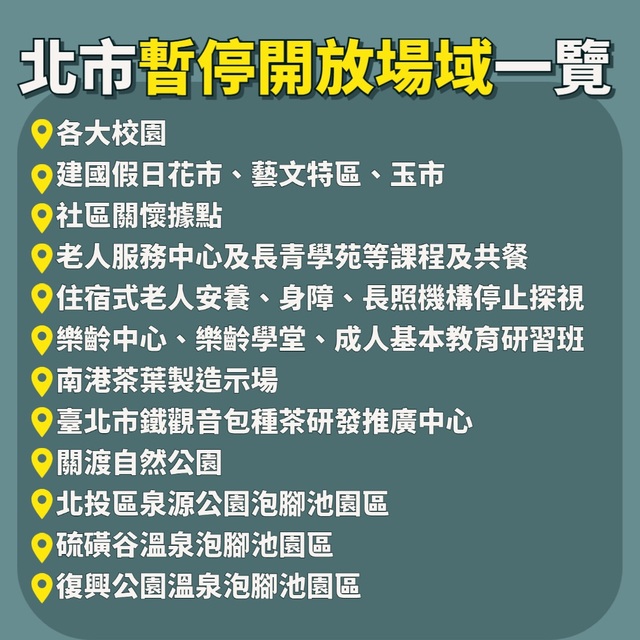 北市府表示,即日起,暫停開放場域包括:各大校園、社會關懷據點、老人共餐、安養機構、建國假日花市、關渡自然公園、各泡腳池園區。