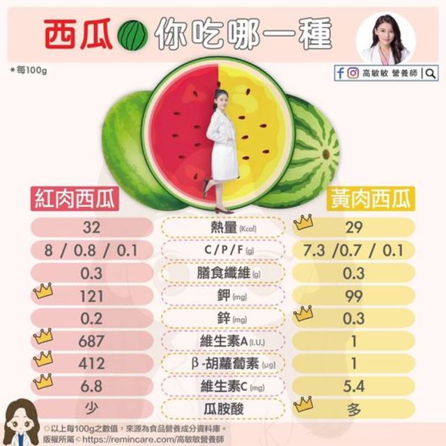 接著,高敏敏也分享紅肉、黃肉西瓜的營養成分比較表,可以看到紅肉西瓜每100公克熱量為32kcal、膳食纖維 0.3g、鉀 121mg、鋅 0.2mg、維生素A 687I.U.、β-胡蘿蔔素 412μg、維生素C 6.8mg;而黃肉西瓜每100公克的熱量則為29kcal、膳食纖維 0.3g、鉀 99mg、鋅 0.3mg、維生素A 1mg、β-胡蘿蔔素 1μg、維生素C 5.4mg,「紅肉、黃肉都有各自的好處跟功效」。