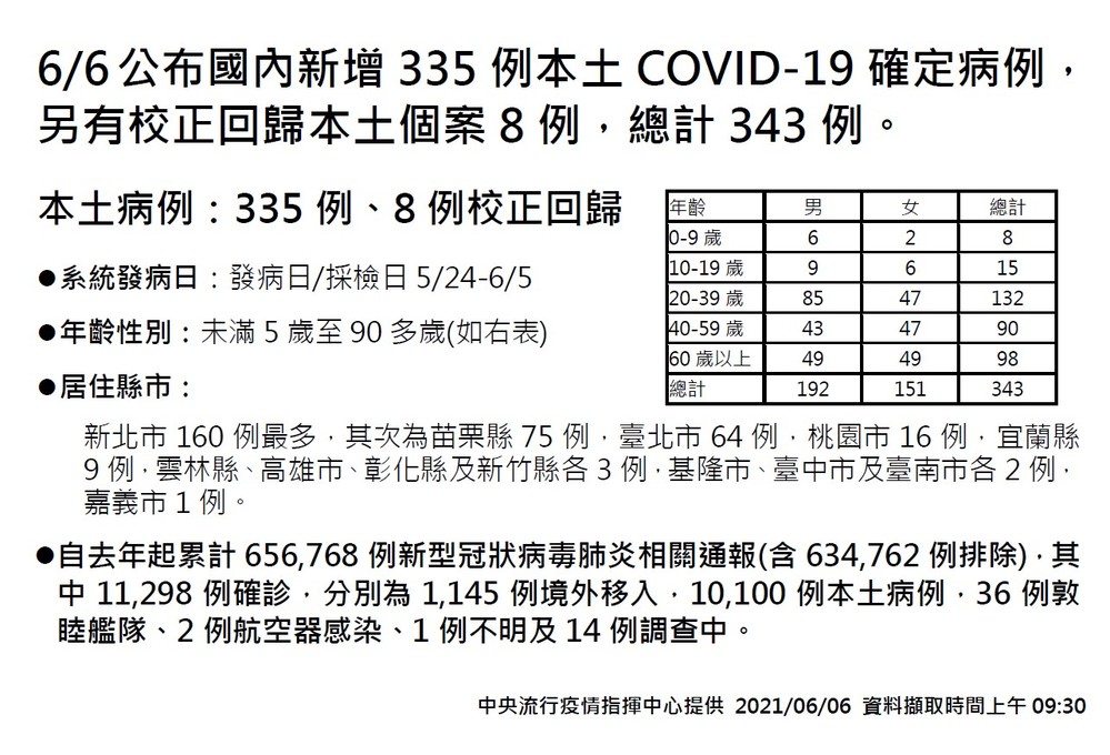 指揮中心表示,今日新增之335例本土病例,為189例男性、146例女性,年齡介於未滿5歲至90多歲,發病日介於今(2021)年5月24日至6月5日。另校正回歸個案8例中,為3例男性、5例女性,年齡介於20多歲至60多歲,發病日介於6月1日至6月2日。