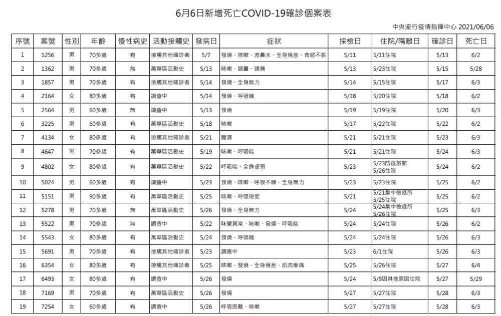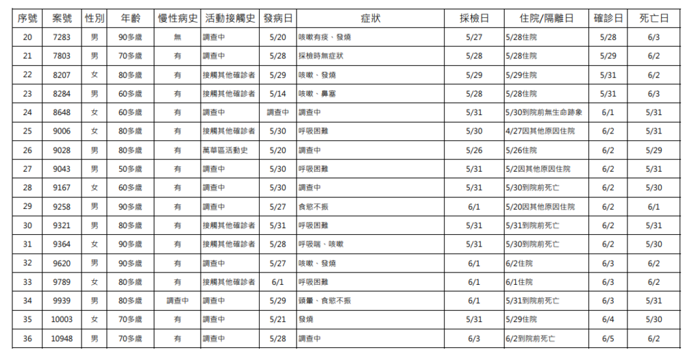 指揮中心說明,今日新增36例死亡個案,共計為男性22位、女性14位,年齡介於50多歲至90多歲,發病日介於5月7日至6月1日,確診日介於5月13日至6月5日,死亡日介於5月28日至6月4日。
