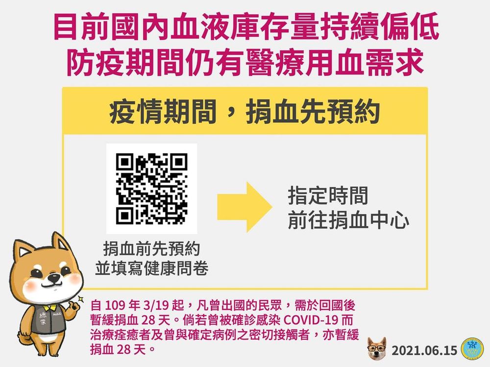 最後,衛福部提醒,目前疫情尚未趨緩,為了用血安全,血液基金會已公告自2020年3月19日開始,凡是有出國的民眾,需於回國後要暫緩捐血28天,另新冠病毒確診痊癒者,或是曾與確診病例密切接觸者,也要暫緩捐血28天。