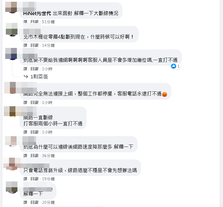 此外,更有不少網友直接到中華電信「HiNet光世代」官方臉書粉專留言反應,「北市木柵從零晨4點斷到現在,什麼時候可以好啊!」、「網路完全無法連接上網,整個工作都停擺,客服電話永遠打不通」、「網路一直斷線 打客服兩個小時一直打不通」、「只會電話推銷升級,線路這麼不穩是不會先想辦法嗎」、「網路爛的可以,打電話客服也沒回應」。