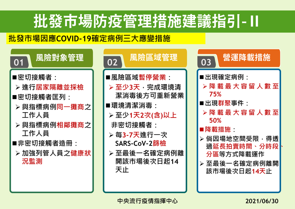 指揮中心進一步表示,「批發市場防疫管理措施建議指引」提供主管機關、場域管理單位及工作人員,依實際可行性與適用性,內化為適合個別場域所需的管理措施,供管理單位、從業人員及採購人員遵循辦理,以降低疫情在批發市場的發生機率、規模及社區傳播風險。