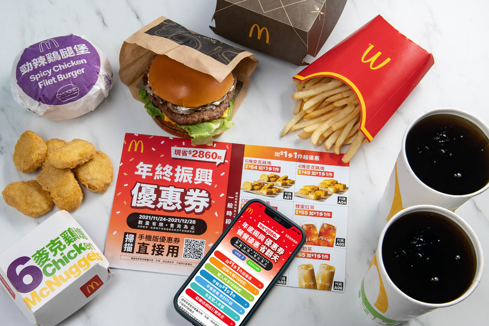 麥當勞表示,為響應政府振興再加碼,將從24日起至12月28日止,推出「年終振興優惠券」好康,最多現省2860元;優惠內容包括6塊或4塊鷄塊、OREO冰炫風、蜂蜜紅茶、蜂蜜奶茶、大杯飲料(限同口味)「加1元多1件」,早餐時段還有美式、那堤也適用此優惠;另外還能爽吃「麥香鷄或吉事牛套餐」主餐、4塊麥克鷄塊、小薯、小杯飲料只要100元;以及早餐時段套餐飲料免費升級中杯美式咖啡、「雙人共享200元起」、「有氧雙人早餐」等共有5大優惠。