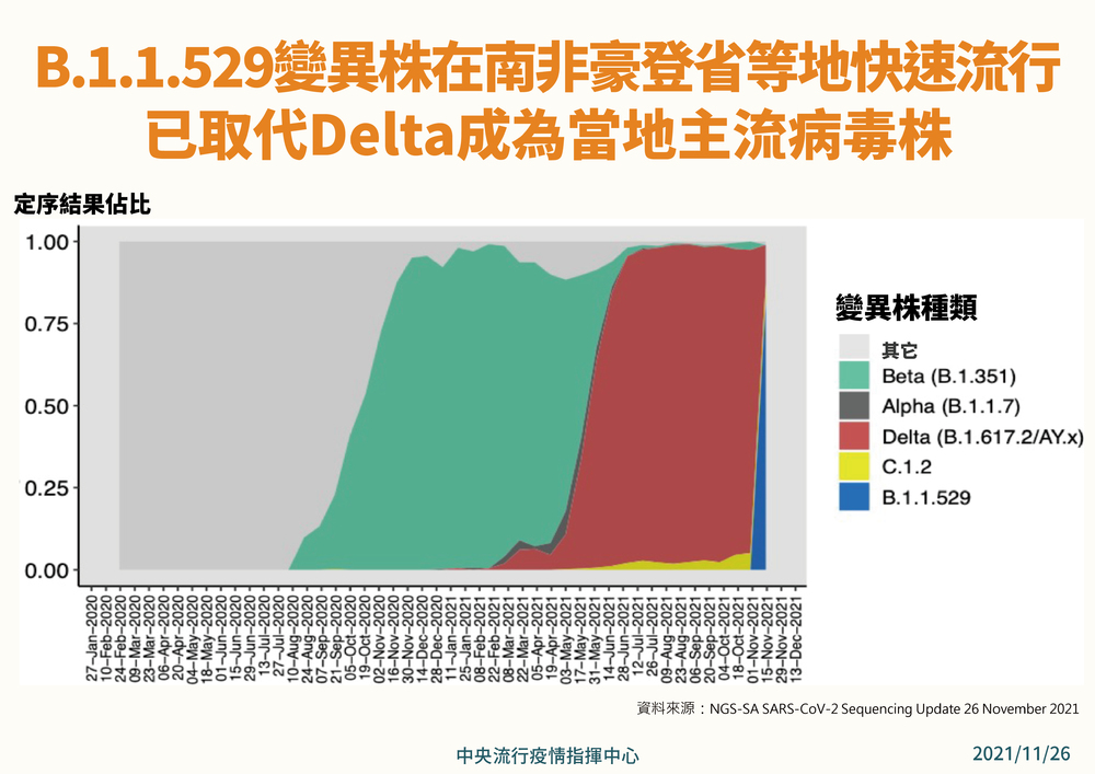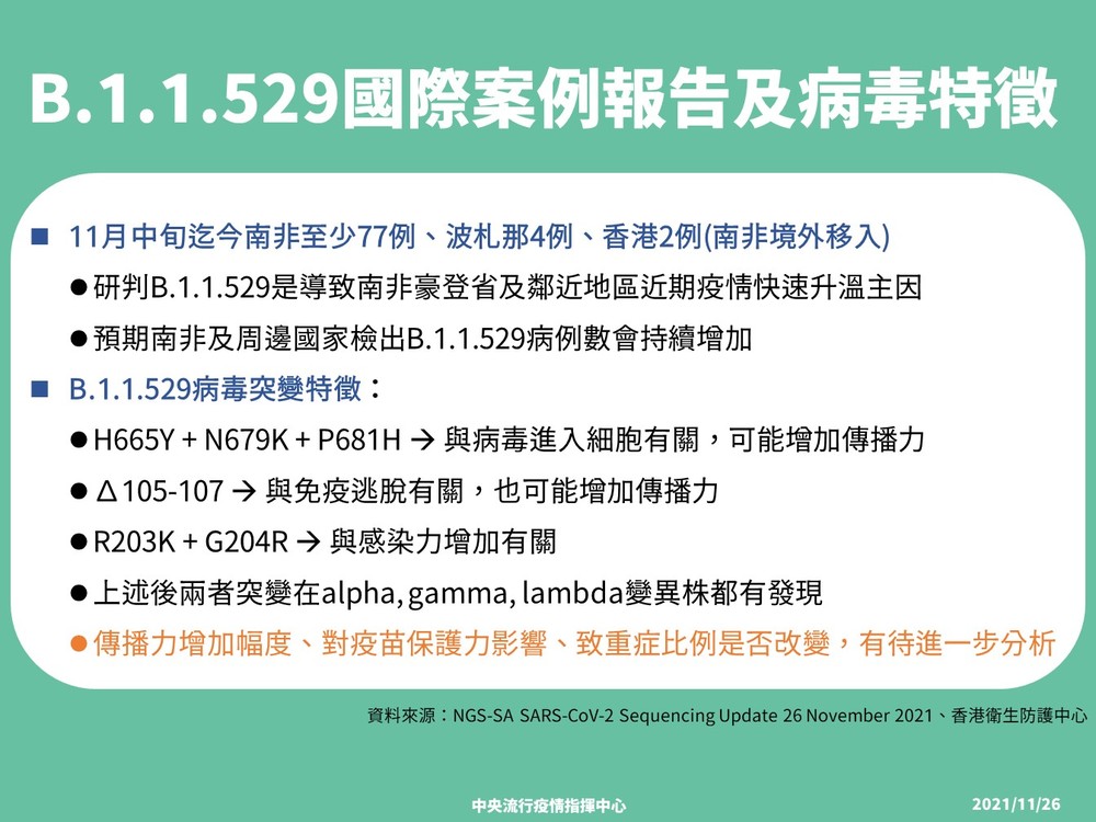 指揮中心醫療應變組副組長羅一鈞補充,此次在南非新發現的新變種病毒株,學名是「B.1.1.529」,不過預計今晚世界衛生組織開會就會給它一個名稱,而其傳播力增加幅度、對疫苗保護力影響、致重症比例是否改變,還有待當地和國際病毒學家再做進一步分析。