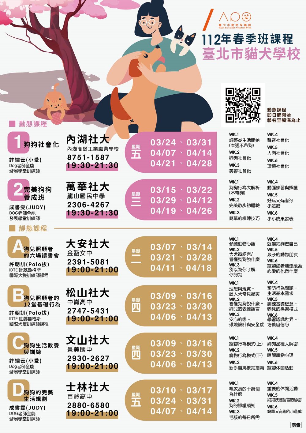 動保處表示,民眾常常到了年底,想參加各式寵物課程,卻已經錯過報名時間,今年貓犬學校春季班自3月7日起限量開設6門課程,靜態課程為4班次,由正向思維藝術行為的訓練師許朝訓(Polo拔老師)講授「狗兒照顧者的6場讀書會」與「狗兒照顧者的12堂基礎行為課」,前者透過一同閱讀與毛孩共處的相關書籍與深入探討,讓飼主更了解狗狗的生命歷程,後者讓飼主從了解狗的肢體語言開始,學習如何建立讓狗狗有安全感的環境。另外還有由Dog老師全能發展學堂的行為訓練師成書雯(Judy老師)及許繡云(小愛老師)分別開設「狗狗生活教養與訓練」與「狗狗的完美生活規劃」,讓毛孩爸媽了解狗狗的行為與肢體語言與跟狗狗的相處與照護秘訣,以及訓練師親授增進與狗狗感情的互動小遊戲。