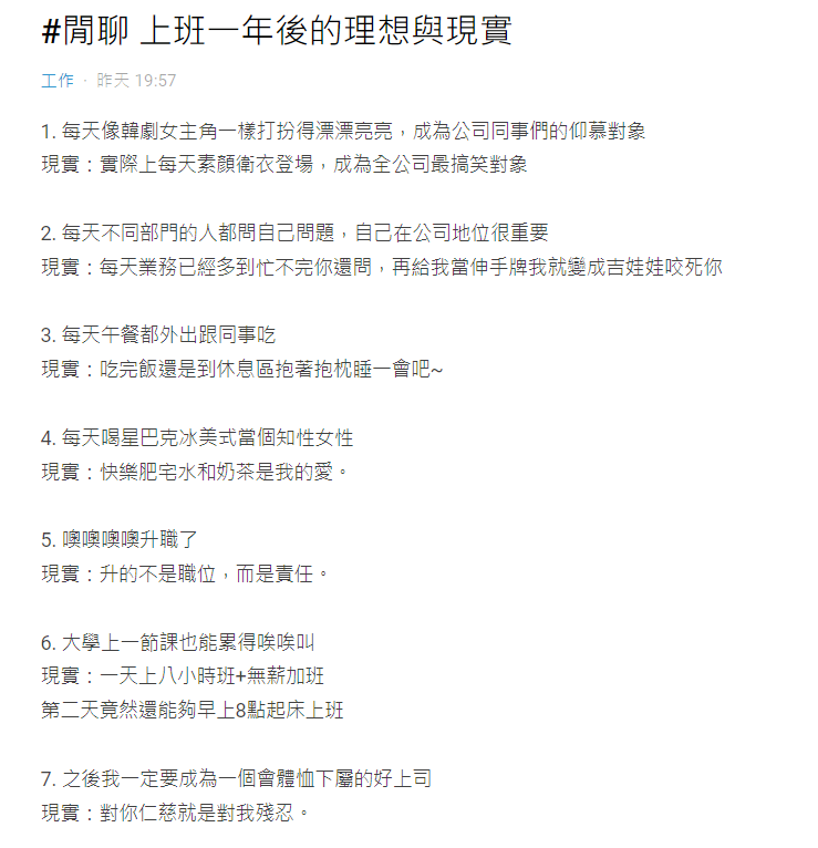 一名網友在Dcard上以「上班一年後的理想與現實」為題發文,列出幾點她工作了一年之後,對比工作上的理想狀態與現實情況的差距。