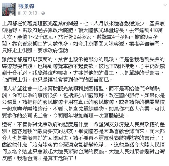 張景森在臉書寫下「不管你對北京政府的態度是什麼,希望網友分清楚人民與政權的差別,陸客是我們最需要交的朋友,畢竟陸客是因為喜歡台灣而來,而大部分人也是帶著美好的回憶回去。請不要再不經意發表歧視陸客的言行了!儘說些什麼「沒有陸客的台灣連空氣都變乾淨」,這些鳥話令大陸人民情何以堪?這些只會激起大陸民眾對台灣的反感」,不過童振源低調表示這是個人言論。