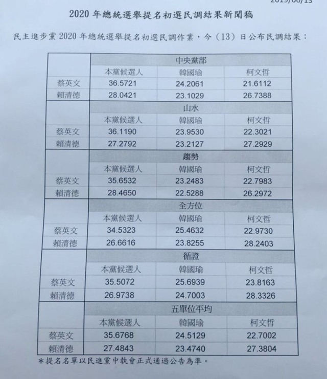 民進黨民調統計結果出爐,總統蔡英文確定在初選民調中以35.67%勝出,將代表民進黨參選2020總統大選,爭取連任。