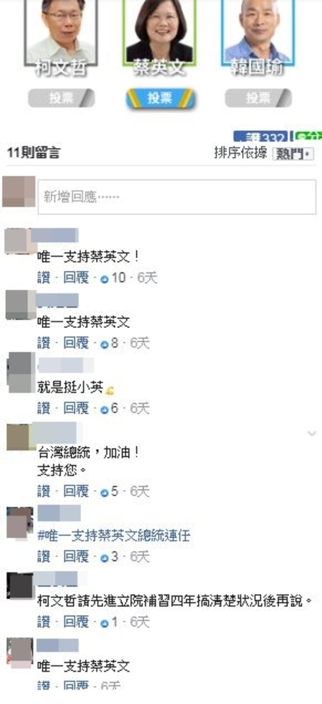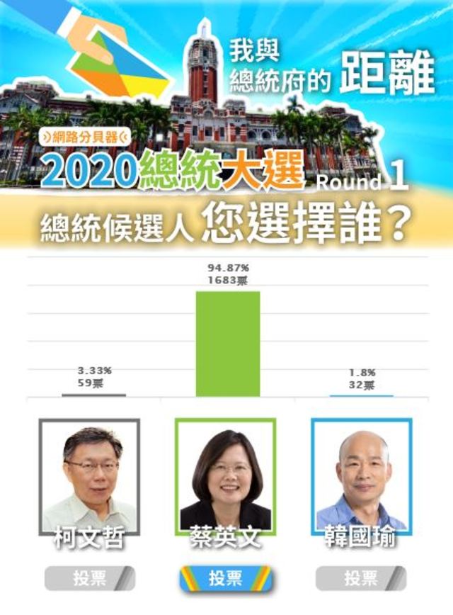 這次的網路票選中,一共列出三位候選人,分別是現任總統蔡英文、韓國瑜以及尚未宣布是否參選的台北市長柯文哲,此網路票選是依據網路聲量來列出候選人及潛在候選人的選項,供民眾進行投票。投票結果以蔡英文獲得1,683票(94.87%)勝出,而柯文哲以59票(3.33%)位居第2名,第三名則是韓國瑜只拿下32票(1.8%),總共有1,774人投票,該貼文也收到331個讚數,其中共收到11則留言,內容多為「唯一支持蔡英文」。