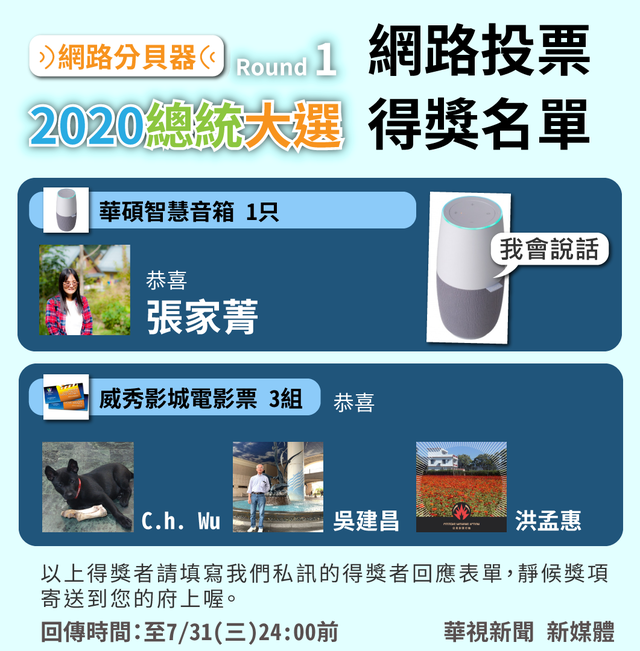 此次網路票選得獎名單也在投票結束後三天抽出,請得獎者填寫華視新聞私訊您的得獎者回應表單,靜候獎項寄送到您府上。華視新聞網也將持續追蹤2020總統大選,未來會推出更多「網路分貝器」的票選活動,請民眾持續關注華視新聞,將帶您追蹤2020大選第一手消息。