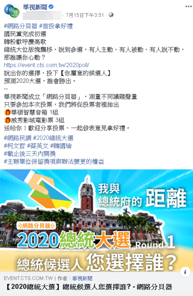 由華視新聞成立的「網路分貝器」,目的是測量不同議題聲量,而這次「網路分貝器 2020總統大選 Round1 總統候選人您選誰?」的網路票選,採FB帳號驗證登入投票,每帳號僅能投出一票。同時將從參加網路票選投票者中,抽出「華碩智慧音箱 1組」、「威秀影城電影票 3組」,邀請民眾一同發表意見拿好禮。