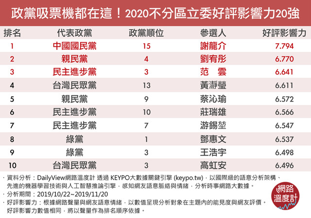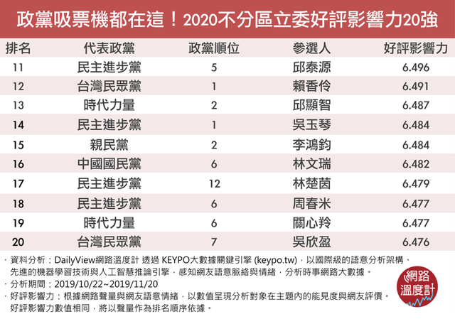 【網路溫度計】政黨吸票機都在這!2020不分區立委好評影響力20強
