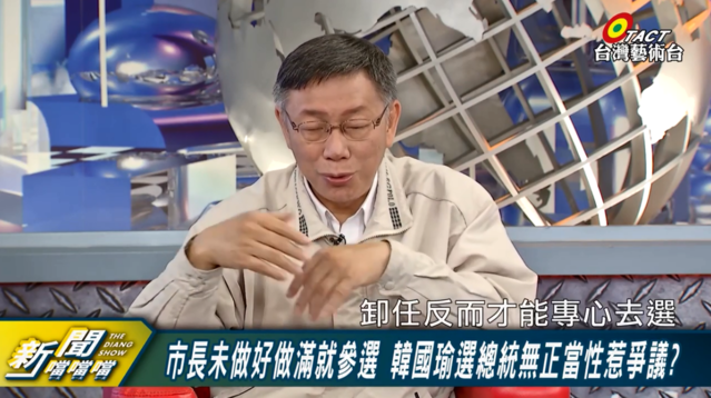 節目主持人張啟楷在《新聞噹噹噹》節目專訪柯文哲,提到柯文哲這次沒有選,下次一定會選嗎?柯文哲說,下一次如果沒有意外的話,就照這樣,這次是因為在當台北市長,還是很多任務在身上,所以以自己的實務經驗,認為高雄市長韓國瑜請假選總統,「非常確信高雄市政一定停擺」。