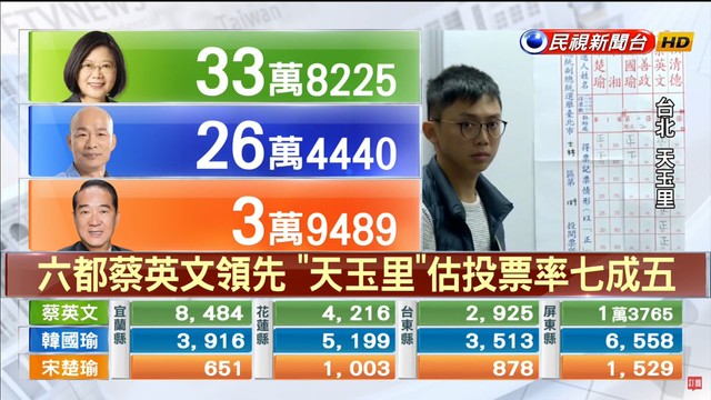 1號 宋楚瑜、余湘(親):3萬9489 2號 韓國瑜、張善政(國):26萬4440 3號 蔡英文、賴清德(民):33萬8225