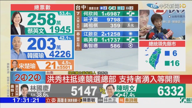 2020總統、立委選舉今(11)日舉行,投票時間已在下午4點結束,全台各投票所即將進行開票作業。華視在下午3點到晚上11點播出「決戰2020大選看華視」不間斷的特別報導,帶您掌握全台最新選情。值得一提的是,華視本次採用中選會及國民黨中央黨部的報票數字,客觀中立不灌票。