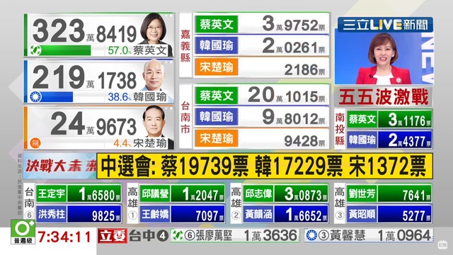 1號 宋楚瑜、余湘(親)24萬9673 2號 韓國瑜、張善政(國):219萬1738 3號 蔡英文、賴清德(民):323萬8419