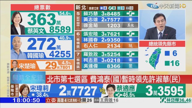 1號 宋楚瑜、余湘(親):29萬7801 2號 韓國瑜、張善政(國):272萬4255 3號 蔡英文、賴清德(民):363萬8589