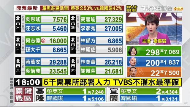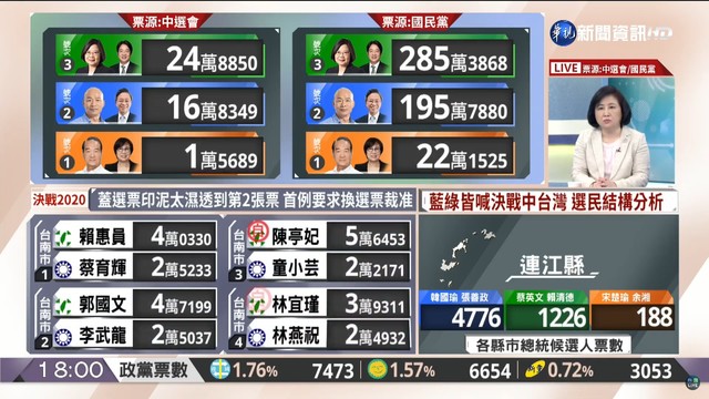 2020總統、立委選舉今(11)日舉行,投票時間已在下午4點結束,全台各投票所即將進行開票作業。華視在下午3點到晚上11點播出「決戰2020大選看華視」不間斷的特別報導,帶您掌握全台最新選情。值得一提的是,華視本次採用中選會及國民黨中央黨部的報票數字,客觀中立不灌票。