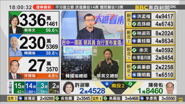 1號 宋楚瑜、余湘(親):27萬3570 2號 韓國瑜、張善政(國):230萬5369 3號 蔡英文、賴清德(民):336萬1461