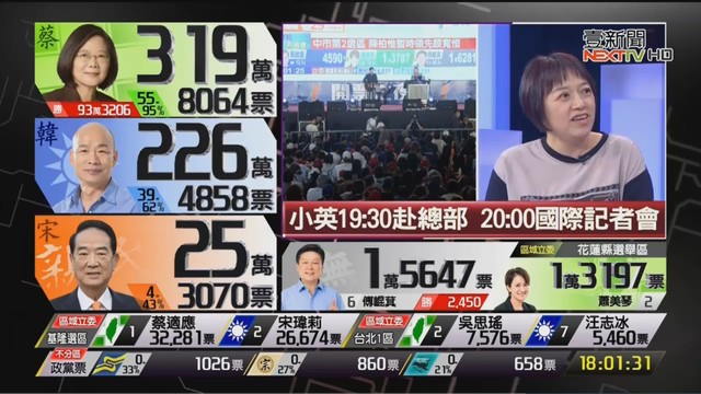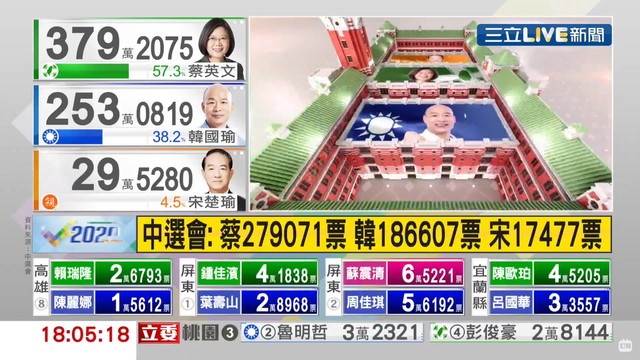 1號 宋楚瑜、余湘(親):25萬3070 2號 韓國瑜、張善政(國):226萬4858 3號 蔡英文、賴清德(民):319萬8064