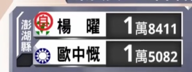立委選舉持續開票,澎湖縣選區民進黨立委候選人楊曜以1萬8千多票領先國民黨對手歐中慨,在稍早自行宣布當選,順利取得連任。