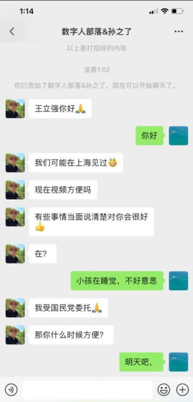 澳大利亞戰略政策研究所研究員周安瀾(Alex Joske)10日在推特公布王立強與孫天群對話截圖,發現是孫天群主動私訊王立強,表示自己受國民黨所託,要求視訊通話,「當面講清楚對你比較好」。